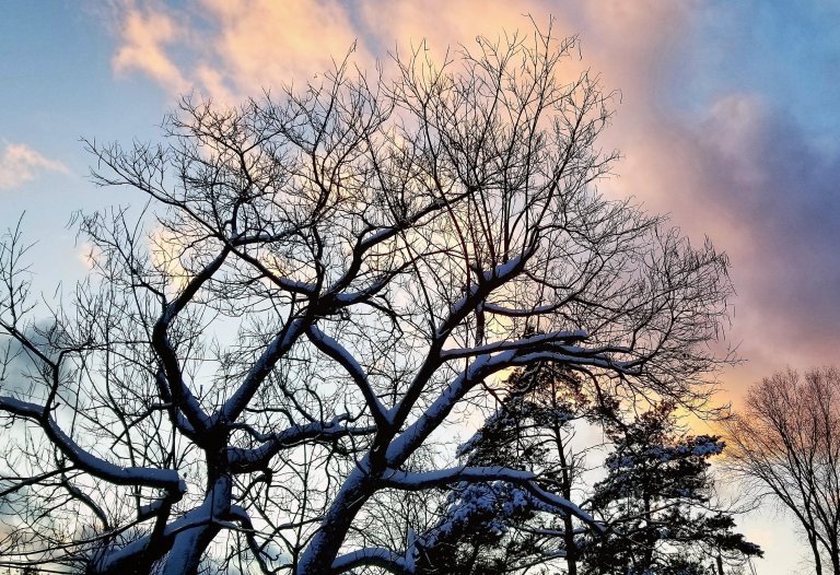 In the above image from the front yard of the farm, a mature catalpa sprawls its limbs like a final yawn before retiring for a good night’s sleep. The setting sun cast a pink glow against the clouds, illuminating the tree from behind.