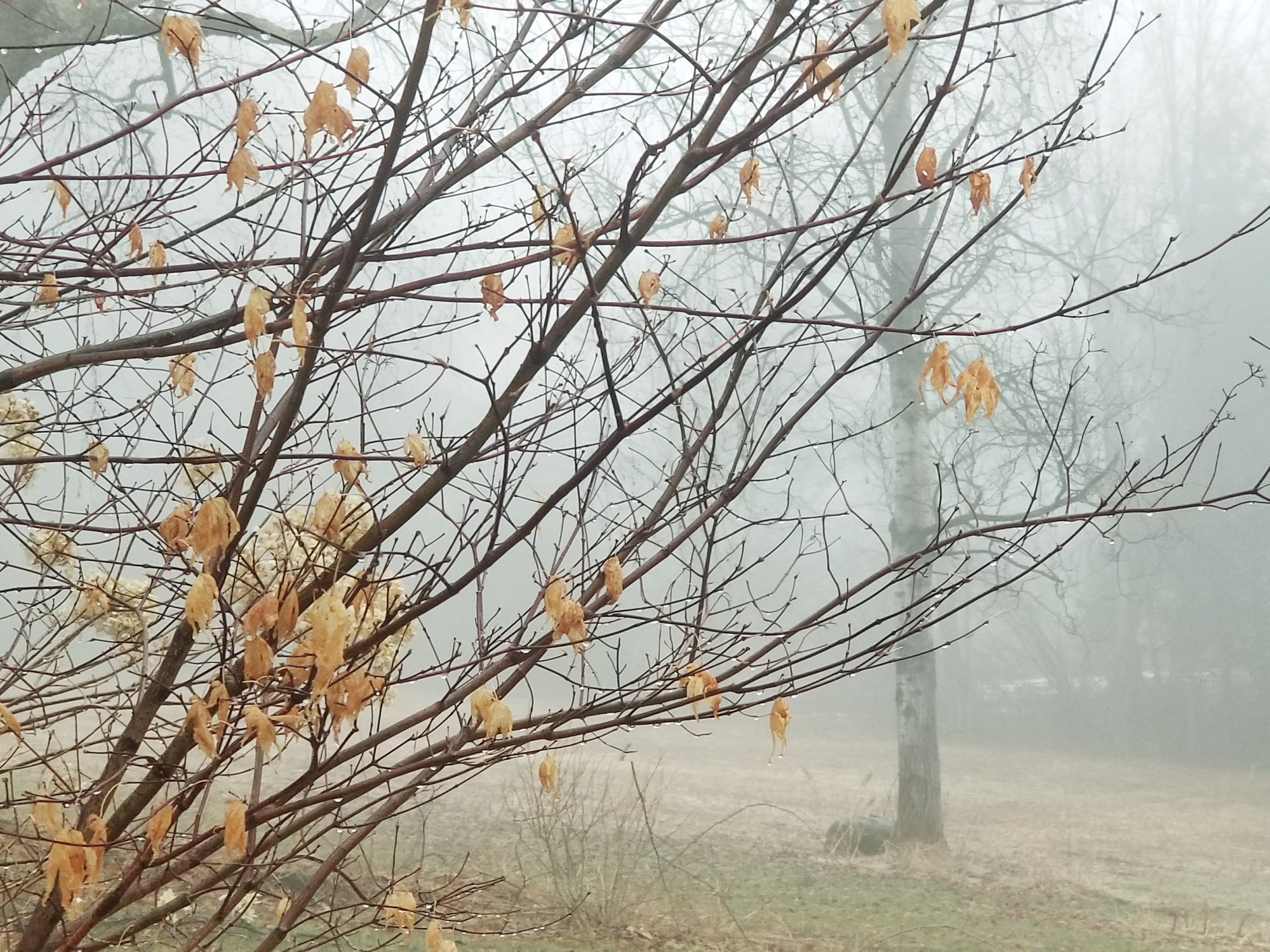 Skeletal trees and shrubs create patterns in the mists.
